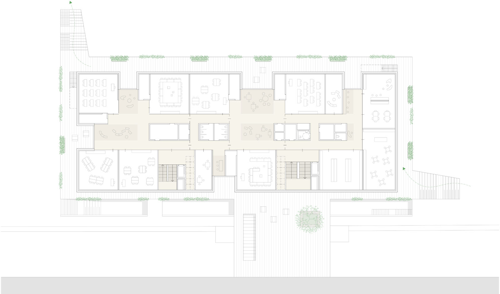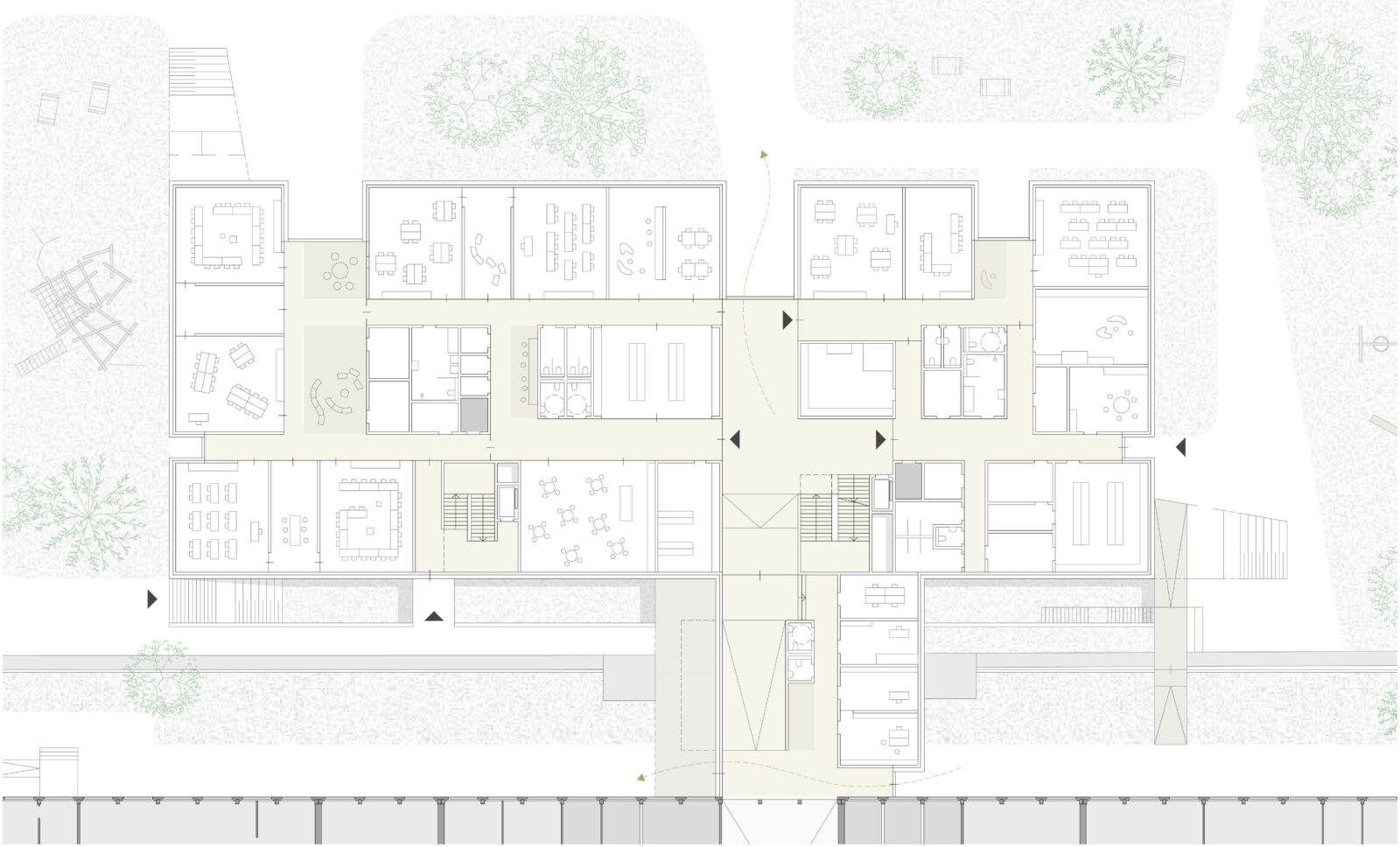 Der bestehende Eingangsbereich wird durch minimale bauliche und funktionale Anpassungen erweitert und bildet zusammen mit dem neuen Verbindungsbereich eine zentrale Achse, von der aus allen Funktionseinheiten zugänglich sind.