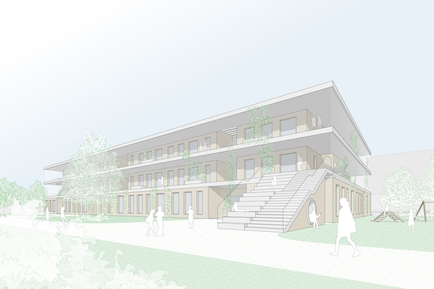 Der bestehende Schulbau wird durch einen neuen Gebäudeteil erweitert, der parallel zum Bestand verläuft und im Erdgeschoss zentral anschließt.